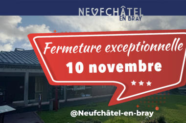 Information aux administrés La Mairie de Neufchâtel-en-Bray sera exceptionnellement fermée au public le lundi 10 novembre 2025. Nous vous remercions pour votre compréhension et vous invitons à anticiper vos démarches