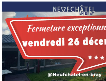 Information aux administrés La Mairie de Neufchâtel-en-Bray sera exceptionnellement fermée au public le vendredi 26 décembre 2025. Nous vous remercions pour votre compréhension et vous invitons à anticiper vos démarches