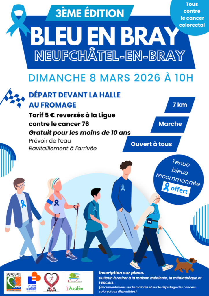 La Ville de Neufchâtel-en-Bray vous donne rendez-vous dimanche 8 mars 2026 pour la marche solidaire Bleu en Bray, organisée aux côtés de la Ligue contre le Cancer 76, des Infirmières ASALÉE, de la Com/Com Bray-Éawy et de l’Amicale Neufchâtel Athlétisme (ANA).