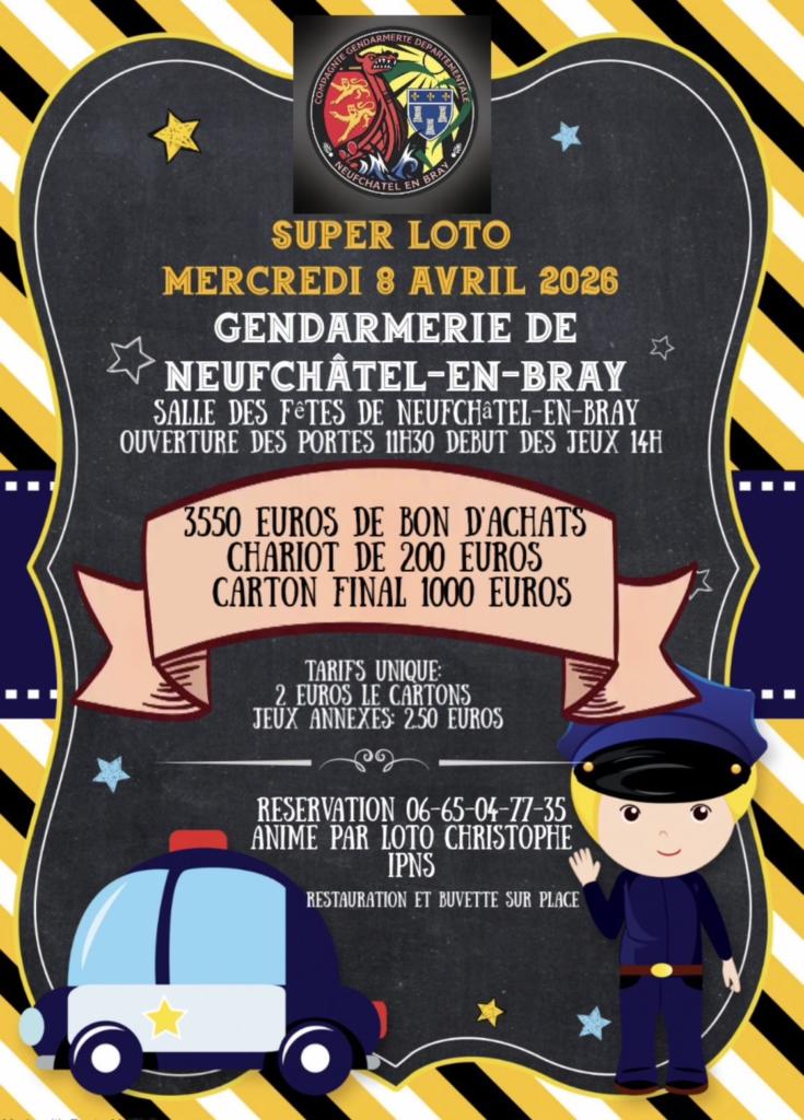 La gendarmerie de Neufchâtel-en-Bray organise un grand loto le mercredi 8 avril à la salle des fêtes de Neufchâtel-en-Bray. Venez tenter votre chance et passer un moment convivial !