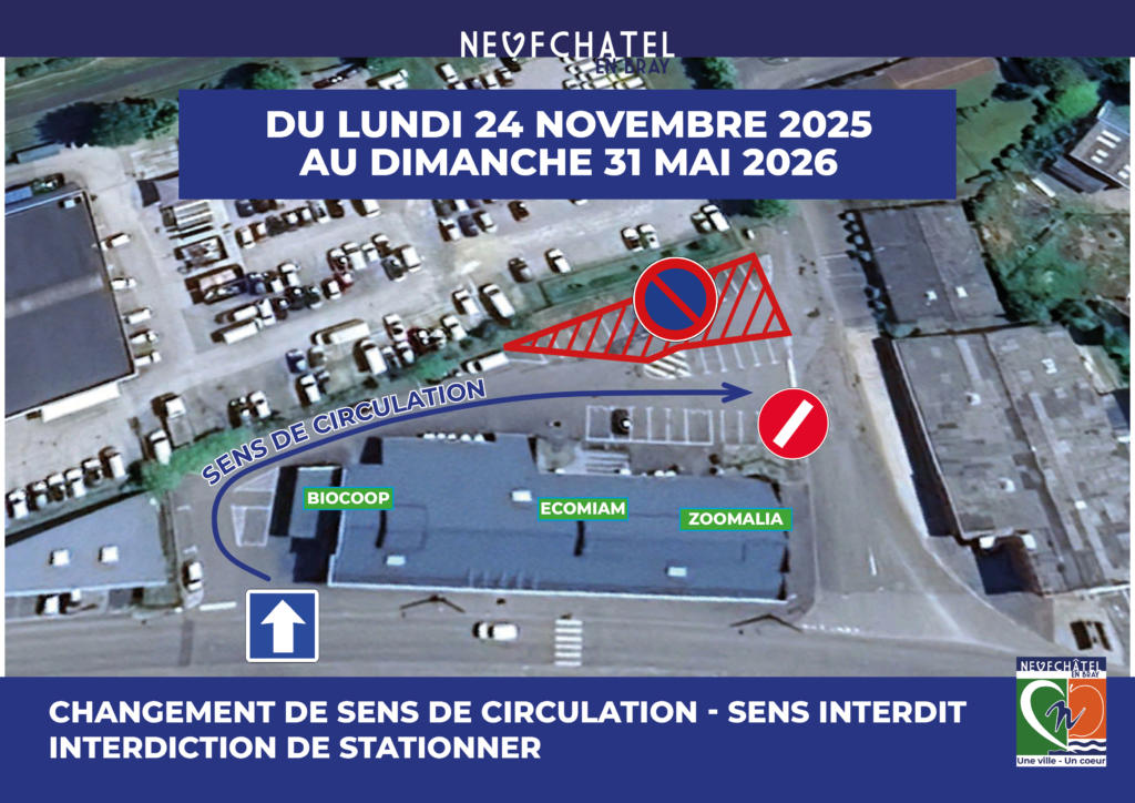 La Ville de Neufchâtel-en-Bray informe les usagers qu’en raison de travaux programmés du 24 novembre 2025 au 31 mai 2026, la circulation sur le parking de la rue de la Petite Vitesse sera temporairement réorganisée.