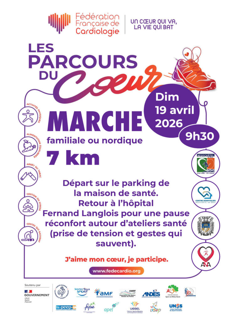 La Ville de Neufchâtel-en-Bray, en partenariat avec l’Hôpital Fernand Langlois, les sapeurs-pompiers et l’Amicale Neufchâtel Athlétisme, vous invite à participer au Parcours du Cœur le dimanche 19 avril 2026.