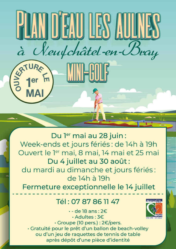 La Ville de Neufchâtel-en-Bray est heureuse d’annoncer l’ouverture du plan d’eau Les Aulnes et de son mini-golf à partir du vendredi 1er mai 2026 !