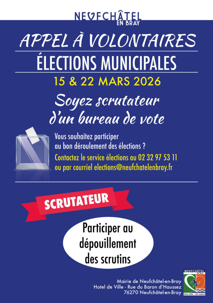 La Ville de Neufchâtel-en-Bray recherche des scrutateurs bénévoles pour les élections municipales des 15 et 22 mars.
