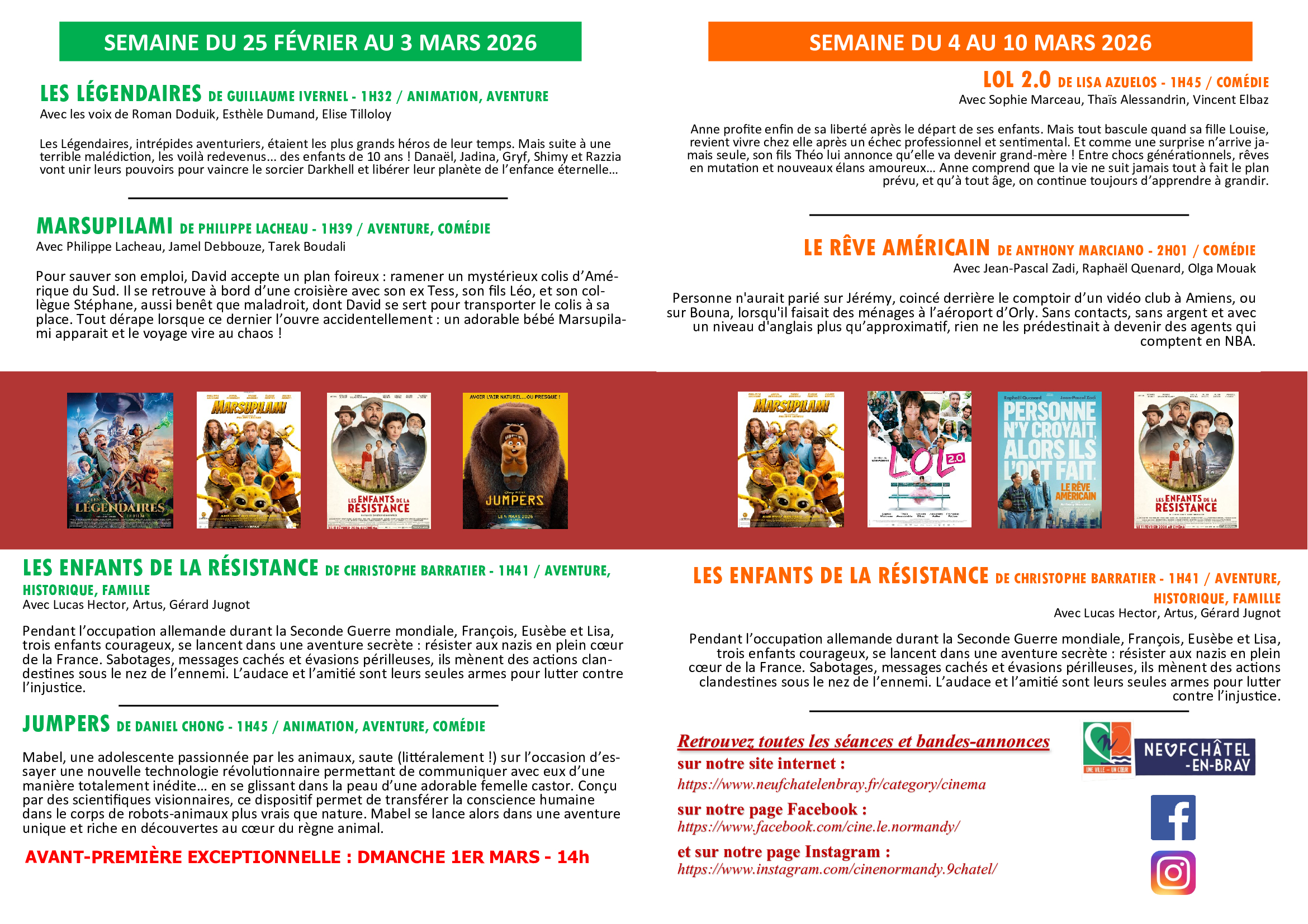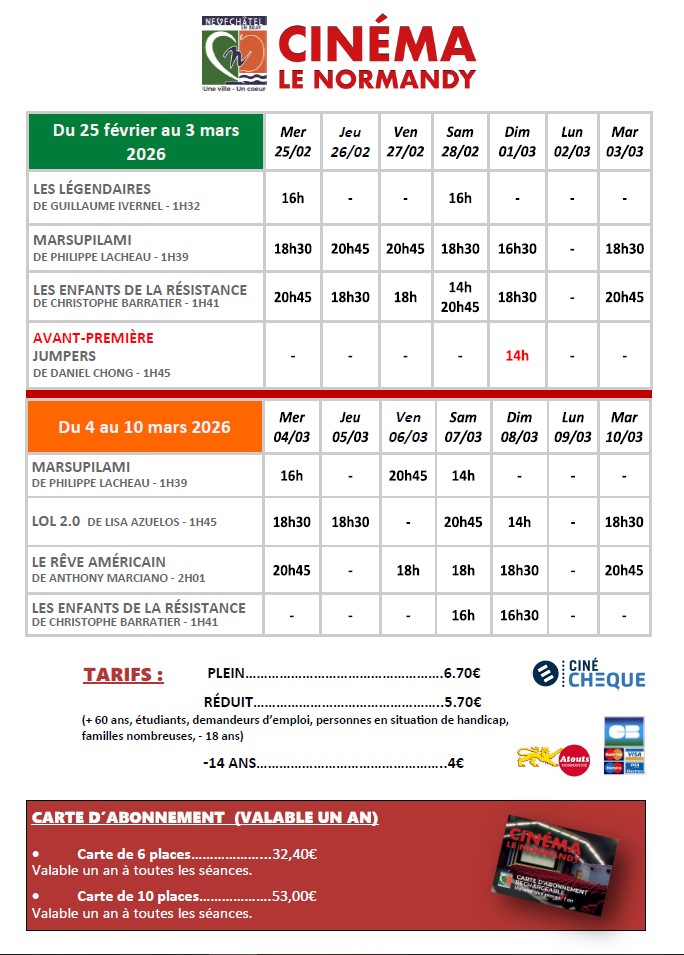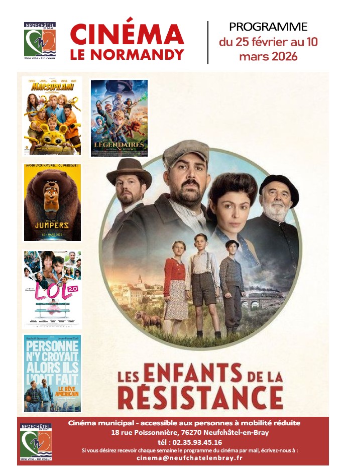 Retrouvez votre programme du 25 février au 10 mars 2026 de votre cinéma LE NORMANDY !!