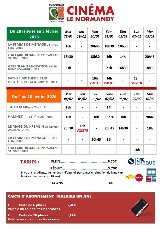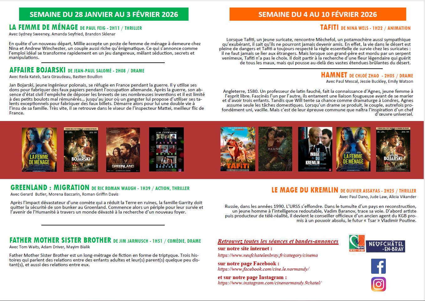 Retrouvez votre programme du 28 janvier au 10 février 2026 de votre cinéma LE NORMANDY !!