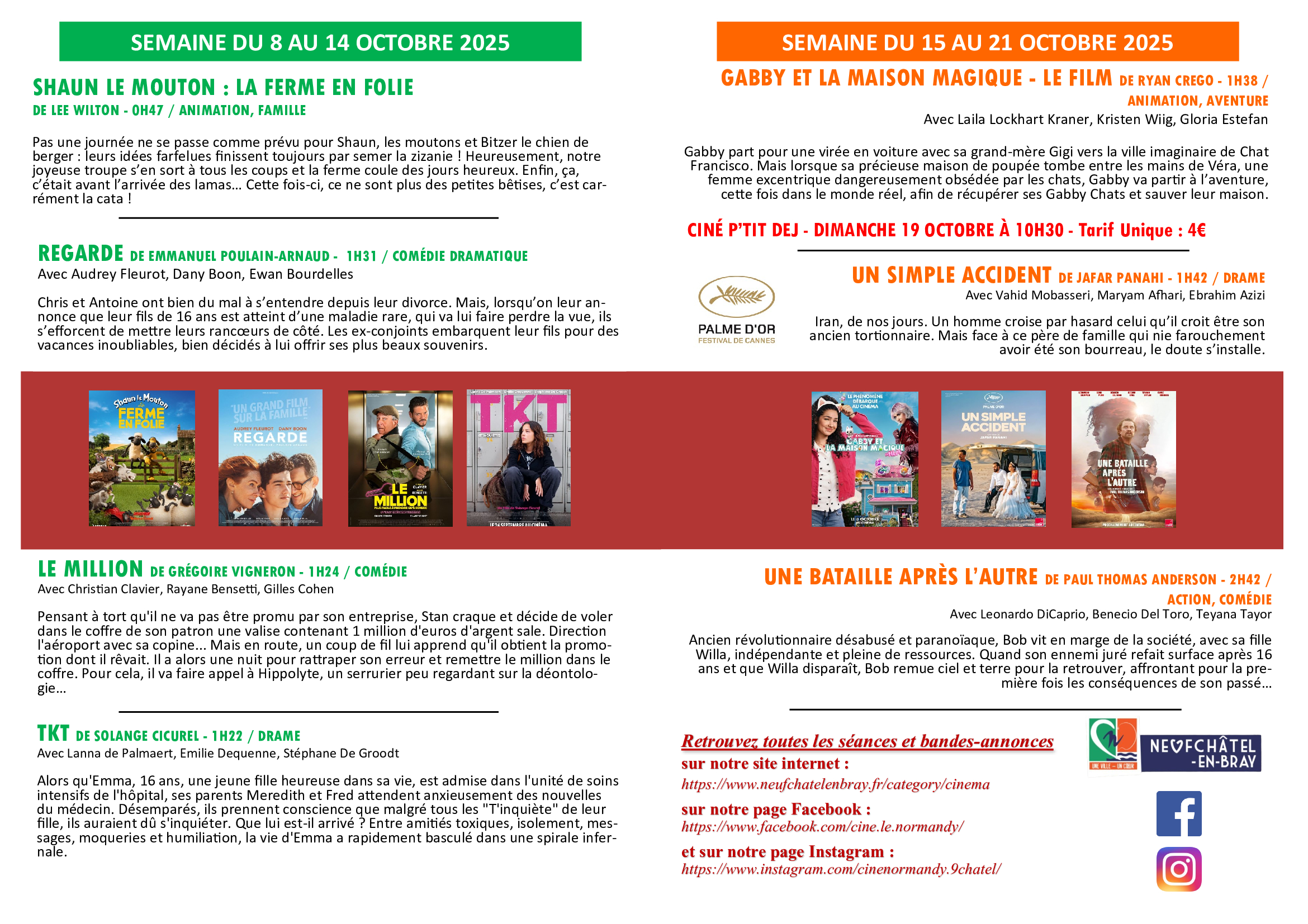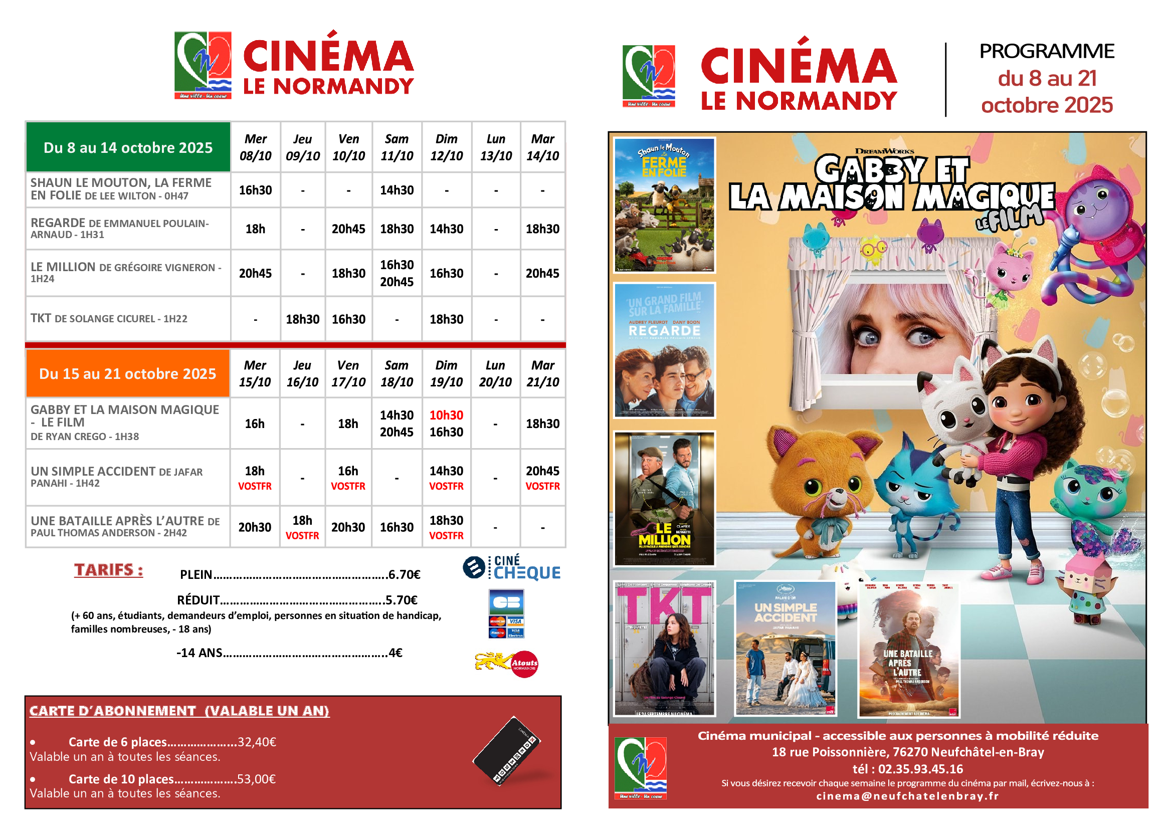 Retrouvez votre programme du 8 au 21 octobre 2025 de votre cinéma LE NORMANDY !!